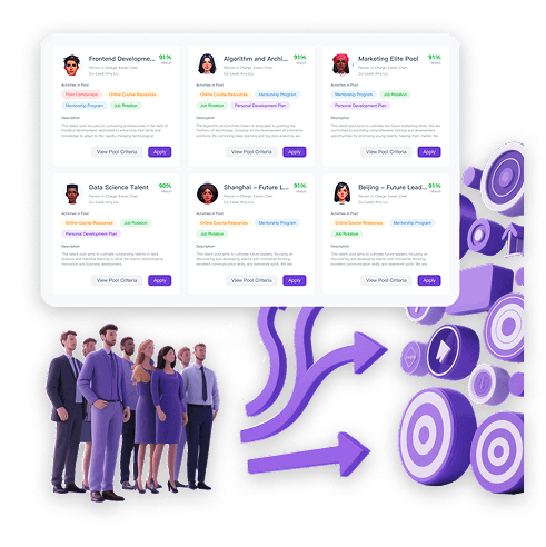 "人才池模块的AI设计极尽人性化。它不仅能将人才精准匹配至人才池,更确保其获得成长所需的资源。游戏化功能使参与率飙升50%。"